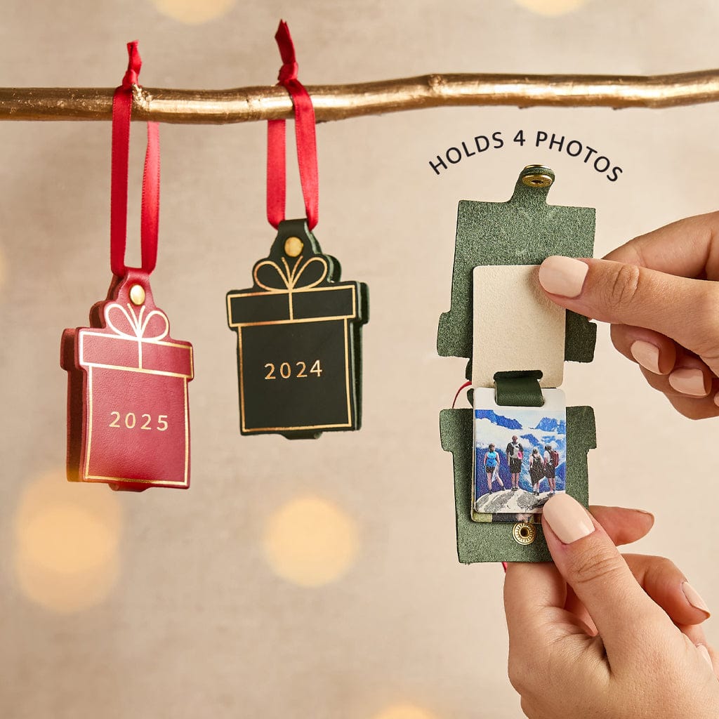 Take a look back on your favourite memories from the year with this luxurious leather Christmas present decoration, holding four photo prints inside.