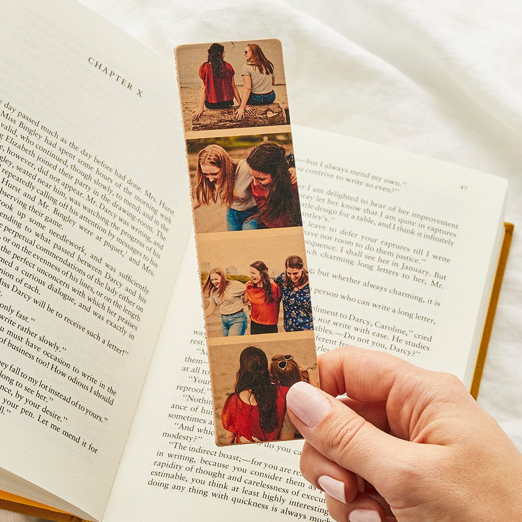 This fun multi-photo leather bookmark can be printed with four of your favourite pictures in a photo booth-inspired strip. The perfect personalised gift for book lovers.