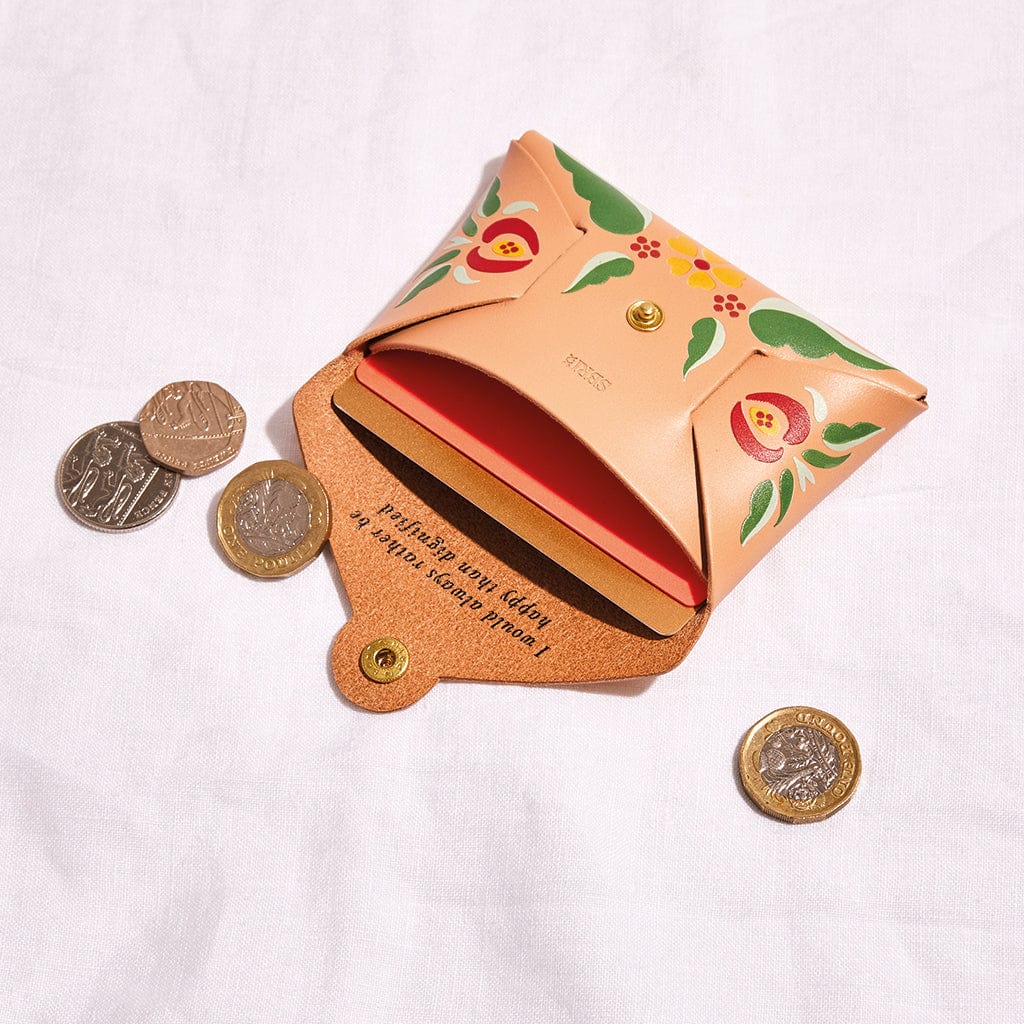 Our little leather purses hold your cards, coins and a note (or two!), so your oversized wallet can take the night off. They're handmade from sustainably sourced, premium quality veg-tanned leather and made to order in the UK, in our New Forest studio to be exact. A clever origami design that’s seamless with no need for stitching, held tight by a secure popper and personalised with hand-stamped initials in gorgeous gold foil.