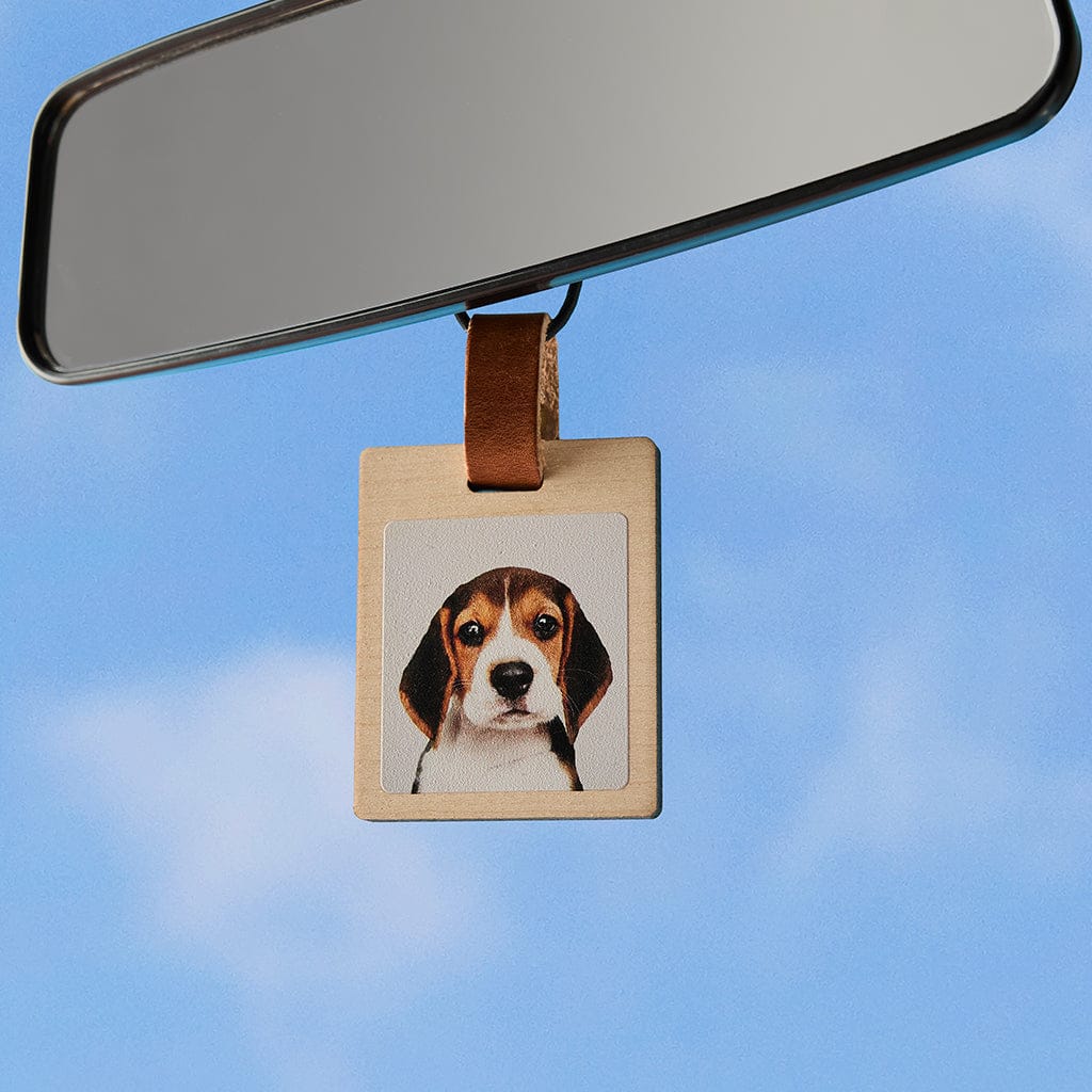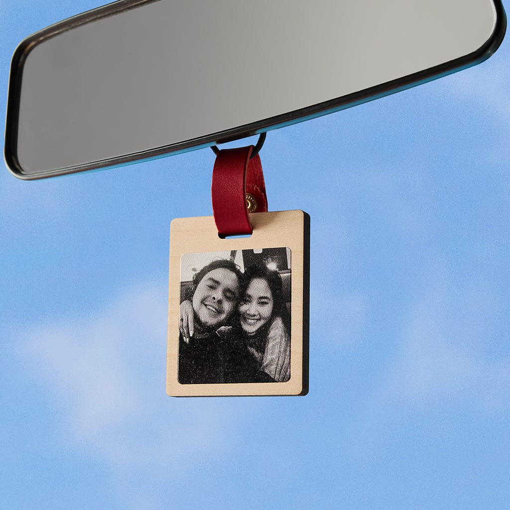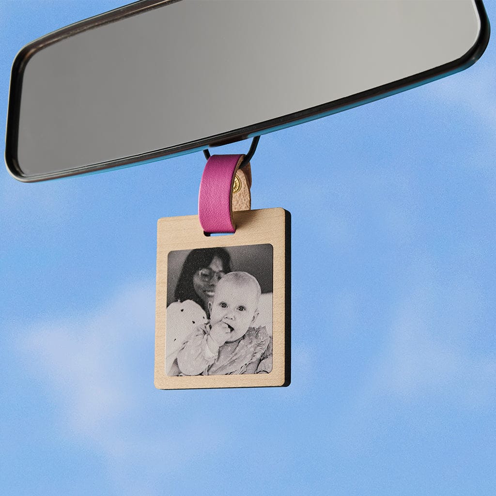 The wooden charms hang from your car’s rear-view mirror from an elastic cord, with a smart leather strap for a colourful accent. We print your photos directly onto the natural wooden surface in full colour, so you can proudly display your favourite picture with your partner, pets, family or friends. Our hanging car photos make great gifts for new drivers who have just passed their test, or as personalised keepsake gifts for your favourite people on birthdays, anniversaries, Mother’s Day or Father’s Day.